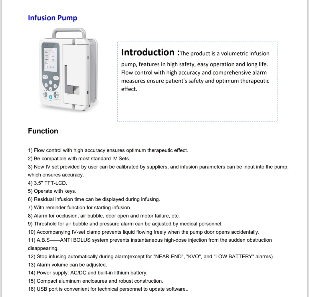 8) Alarm for occlusion, air bubble, door open and motor failure, etc.
